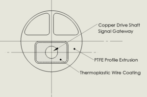 In this example, a PTFE multi-lumen with a square cross-sectional lumen is made, and there is a desire to insert a wire into the lumen but not allow it to twist relative to the PTFE profile. This design (Figure 7) would use a thermoplastic extruded wire profile as the insert into the PTFE lumen. This design is impossible without thermoplastic extrusion as a typical uniform wire coating would not work effectively. If using a bonded wire technology, significant torque could be imparted to this signal-carrying wire to expand the design options further.