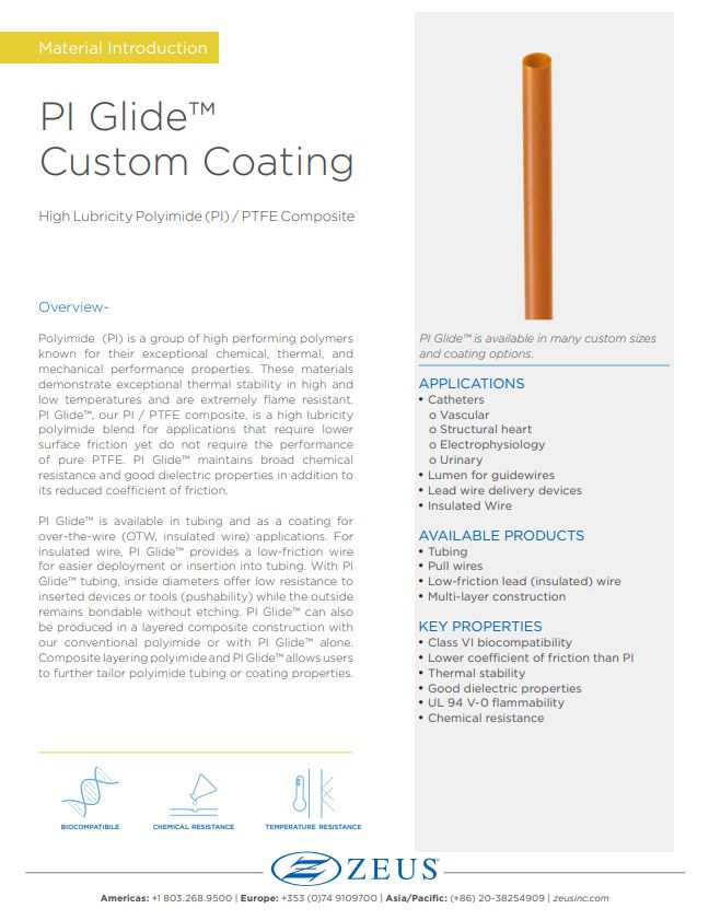 With a combination of mechanical toughness, thermal stability, and radiation and chemical resistance, Zeus PI tubing is well-suited for a wide variety of medical and industrial applications. When enhanced lubricity is required, PI Glide™, a PI/PTFE composite, provides up to 25% lower coefficient of friction over standard PI.