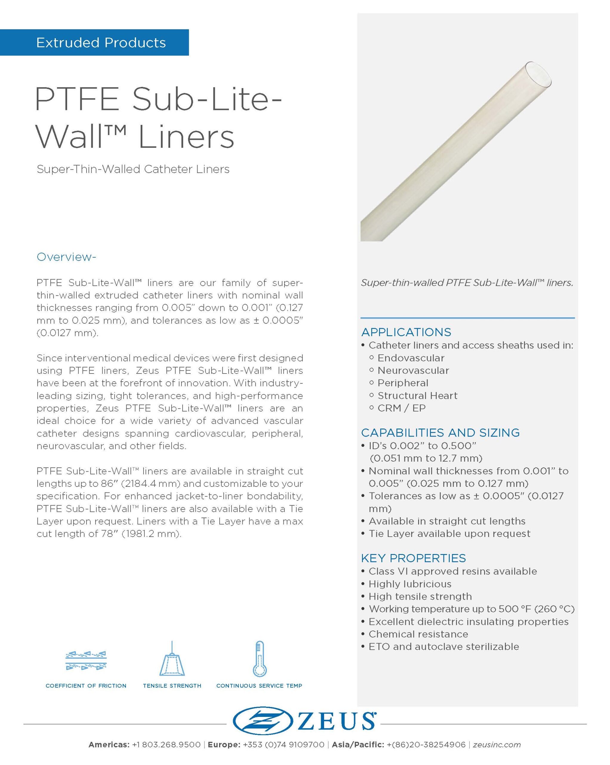 With industry-leading sizing, tight tolerances, and high-performance properties, Zeus PTFE Sub-Lite-Wall™ liners are an ideal choice for a wide variety of advanced vascular catheter designs. Super-thin-walled PTFE Sub-Lite-Wall™ liners can be produced with wall thicknesses ranging from 0.001” – 0.005” (0.025 mm – 0.127 mm), tolerances as low as ± 0.0005″ (0.0127 mm), and with uniform inside and outside diameters.