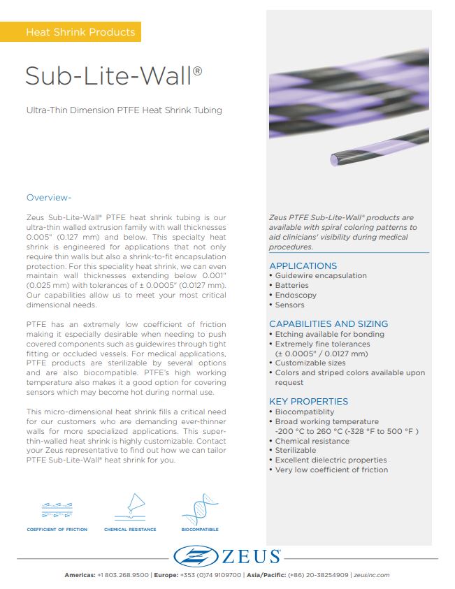 Zeus Sub-Lite-Wall™ heat shrink is our family of ultra-thin walled heat shrink tubing. This thin-walled heat shrink fills a critical requirement for our customers requiring thinner walls for specialized applications.
